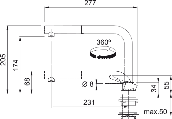 Ανάμεικτη Μπαταρία κουζίνας Active Window, ντους, προσαρμόσιμο ύψος, χρωμέ, υψηλή πίεση, κατάλληλη για κάτω από παράθυρο.Η μπαταρία δεν διαθέτει χειριστήριο. Απαιτούνται δύο οπές. Μέγιστη απόσταση μεταξύ μπαταρίας και χειριστηρίου 50mm