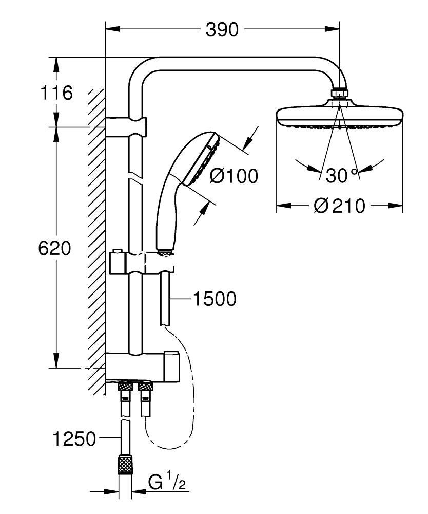 • οριζόντιο βραχίονα ντους 390 mm, ρυθμιζόμενο πριν την εγκατάσταση