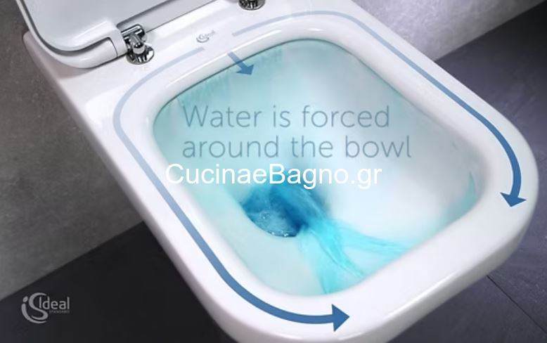 Χάρη στο εσωτερικό περιμετρικό στεφάνι ροής νερού, το νερό ρέει από την κορυφή της λεκάνης, καθαρίζοντας το 100% της επιφάνειας.