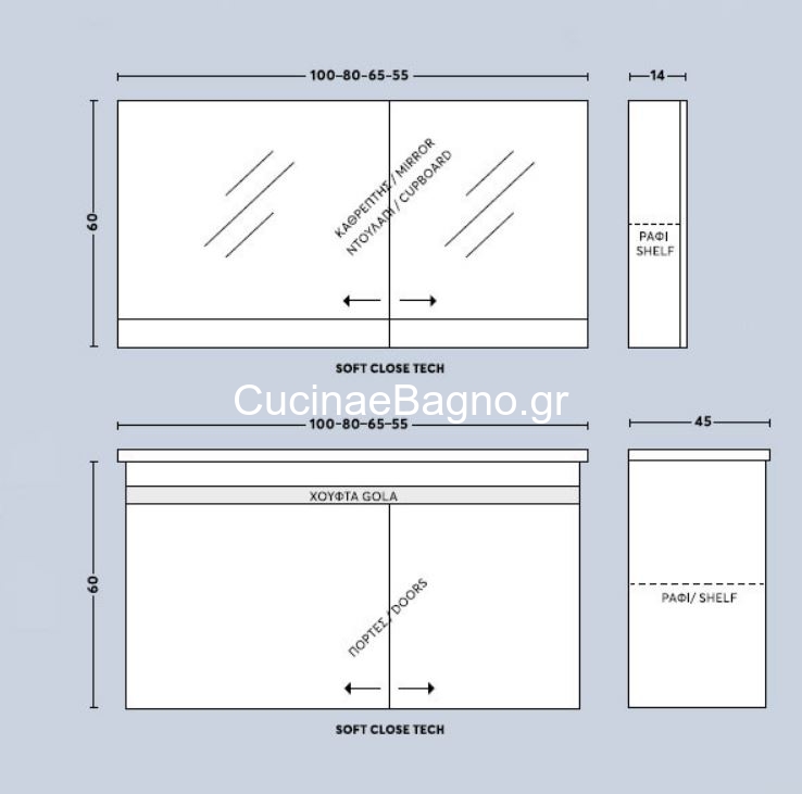 • Καθρέπτης κρεμαστός, κρυφοντούλαπο με δύο πορτάκια soft close (αργό κλείσιμο), από M.D.F με επένδυση laminate. Διάσταση (Μ x Π x Y): 80 x 14 x 60 cm