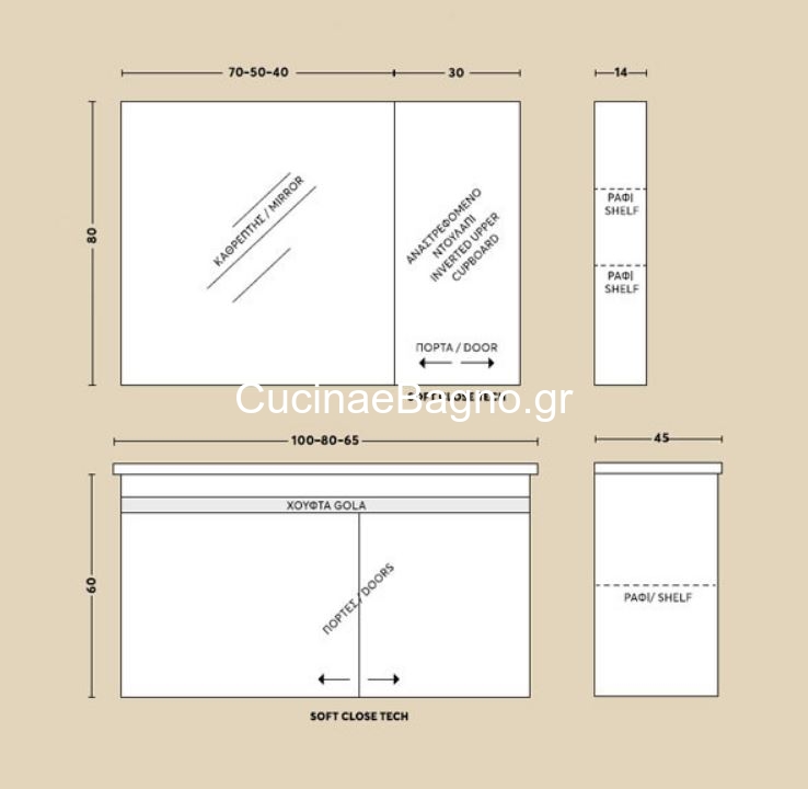 • Άνω ντουλάπι αναστρεφόμενο HOPE με ένα πορτάκι soft close (αργό κλείσιμο), από M.D.F με επένδυση laminate. Διάσταση (Μ x Π x Y): 30 x 80 x 14 cm