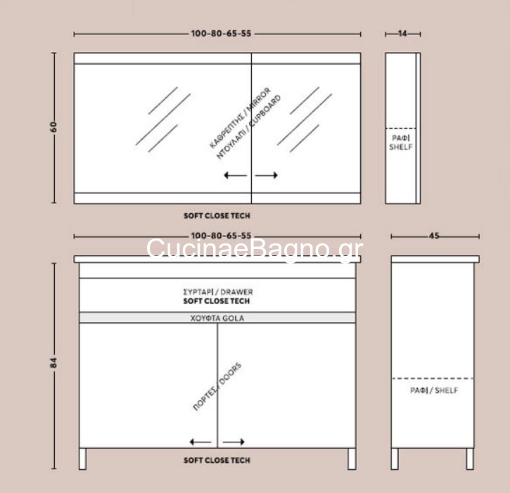 Πάγκος δαπέδου με δύο πορτάκια κι ένα συρτάρι soft close (αργό κλείσιμο), από M.D.F με επένδυση laminate. Διάσταση (Μ x Π x Υ): 65 x 45 x 84 cm