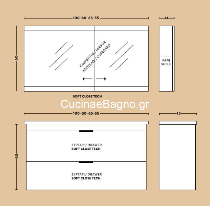 • Καθρέπτης κρεμαστός, κρυφοντούλαπο με δύο πορτάκια soft close (αργό κλείσιμο), από M.D.F με επένδυση laminate. Διάσταση (Μ x Π x Y): 55 x 14 x 60 cm