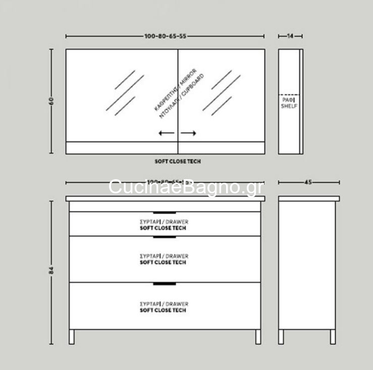 • Πάγκος δαπέδου με τρία συρτάρια soft close (αργό κλείσιμο), από M.D.F με επένδυση laminate. Διάσταση (Μ x Π x Υ): 55 x 45 x 84 cm
