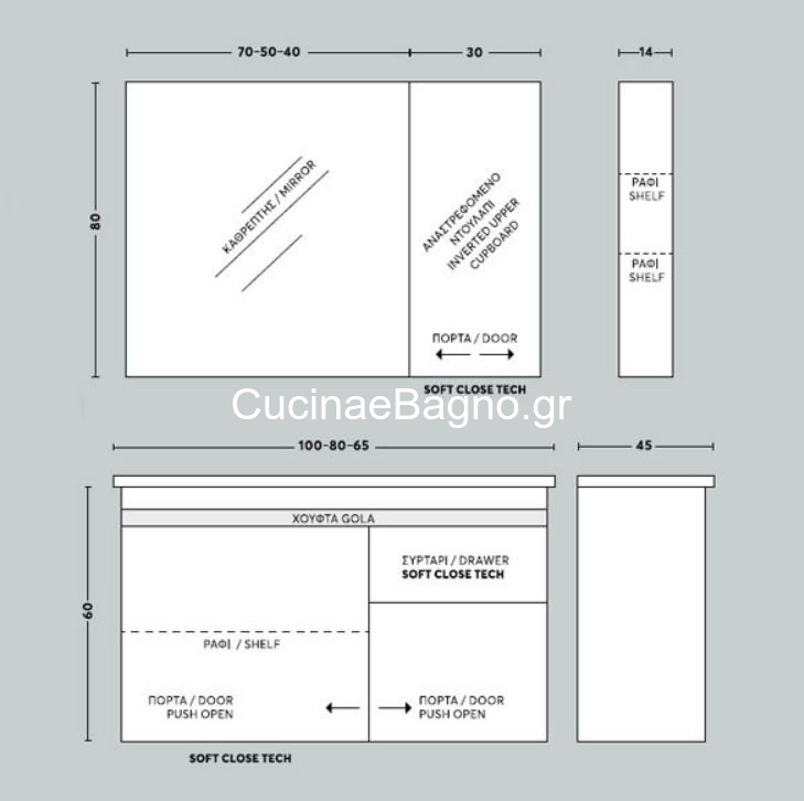 • Άνω ντουλάπι αναστρεφόμενο HOPE με ένα πορτάκι soft close (αργό κλείσιμο), από M.D.F με επένδυση laminate. Διάσταση (Μ x Π x Y): 30 x 80 x 14 cm