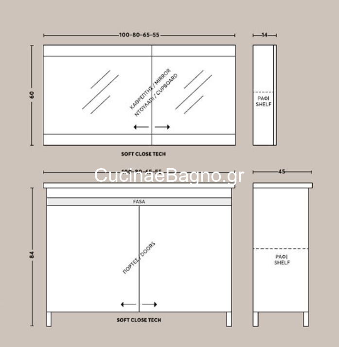 Πάγκος δαπέδου με δύο πορτάκια soft close (αργό κλείσιμο), από M.D.F με επένδυση laminate. Διάσταση (Μ x Π x Υ): 100 x 45 x 84 cm