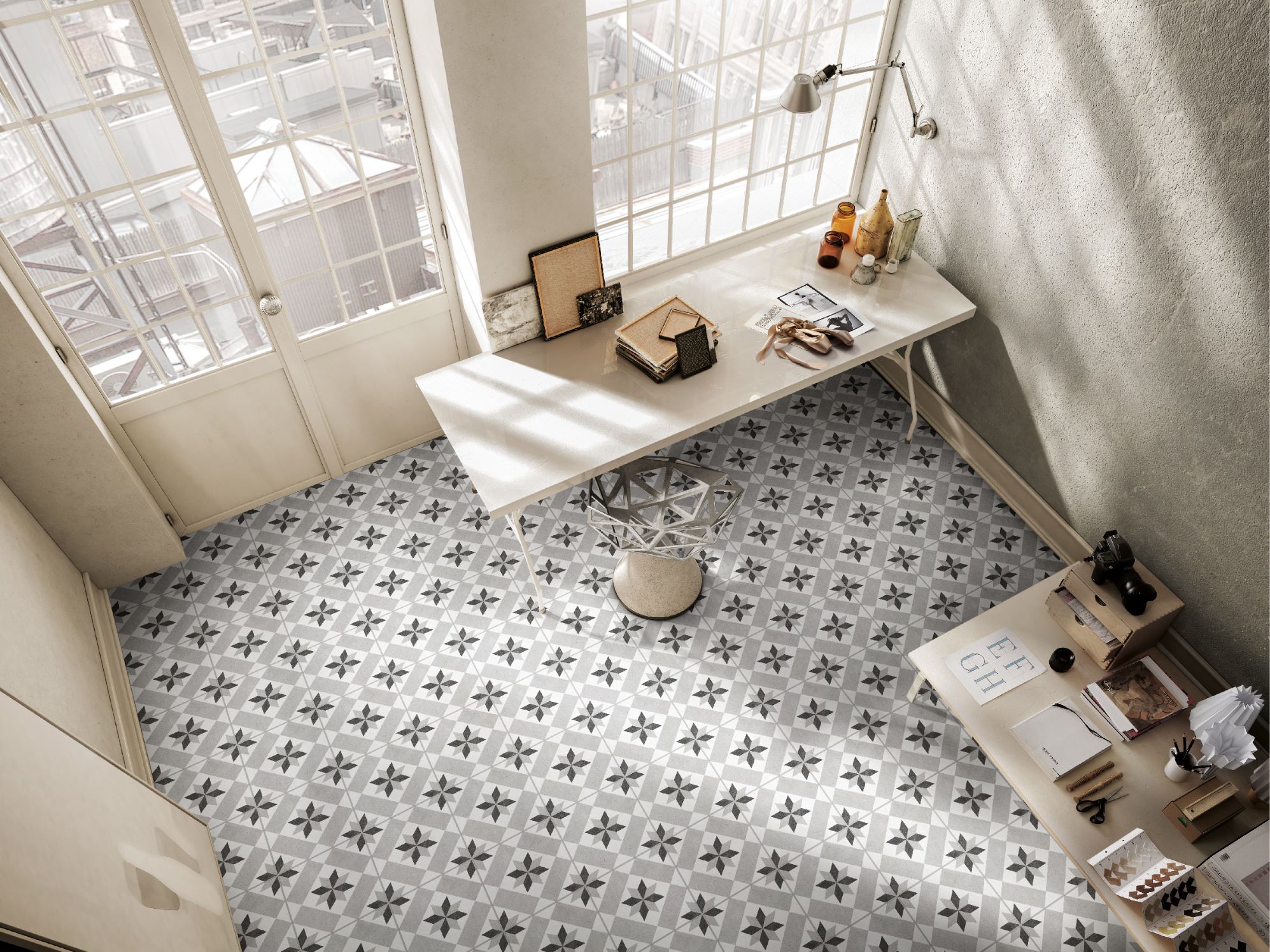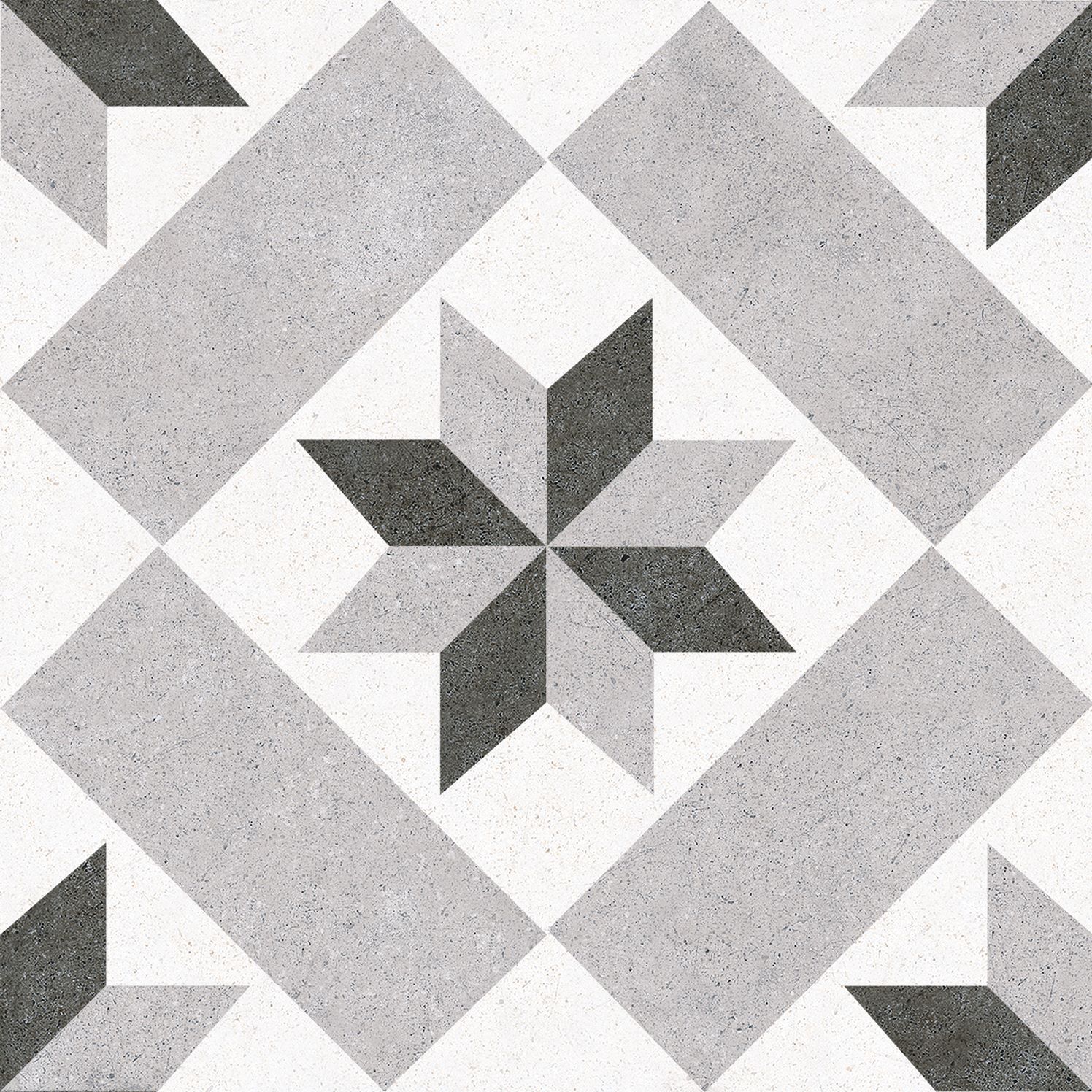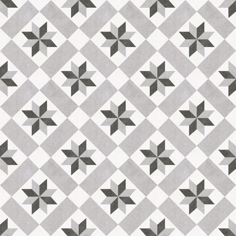 Ρετρό πλακάκι 25x25 με γεωμετρικό μοτίβο «αστέρι» σε γκρι αποχρώσεις – ιδανικό για vintage και μοντέρνους χώρους.